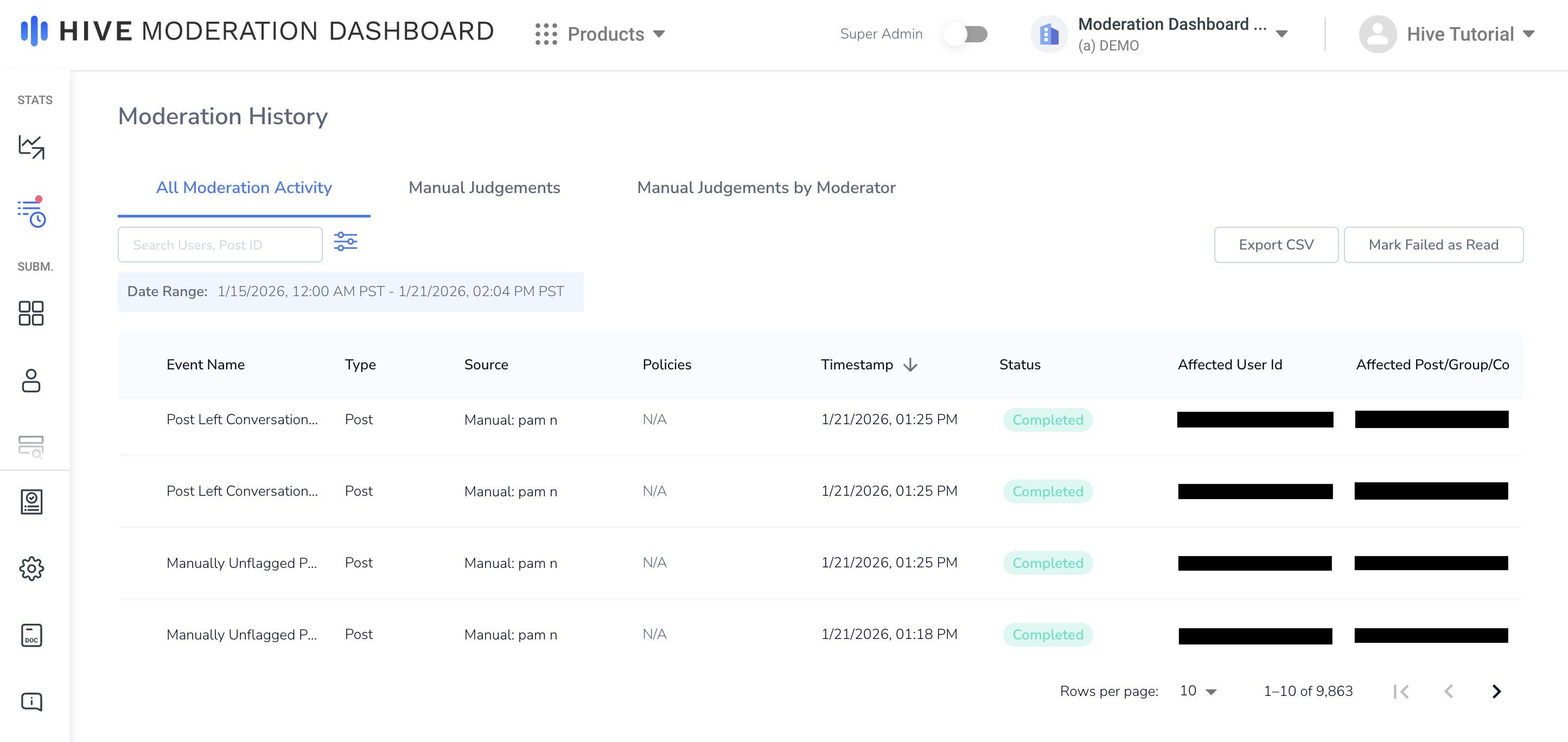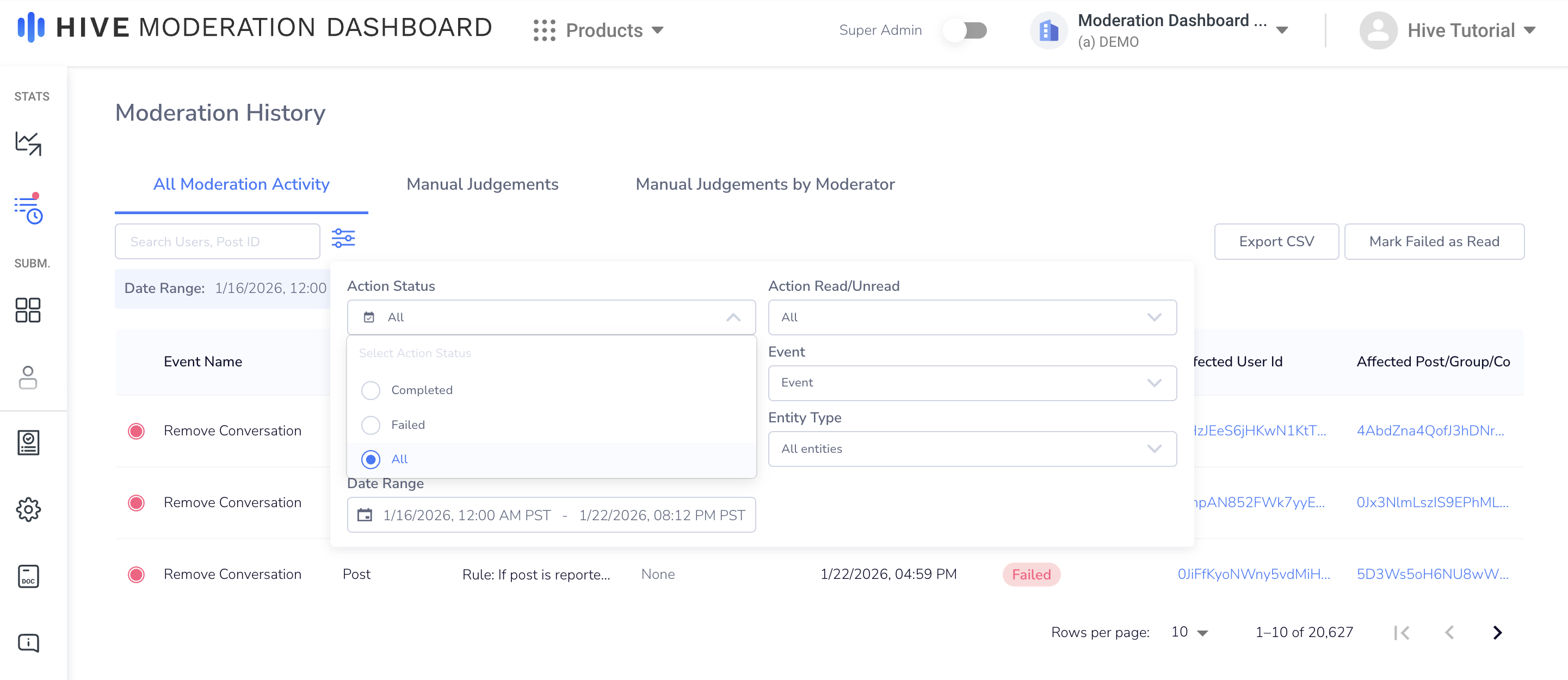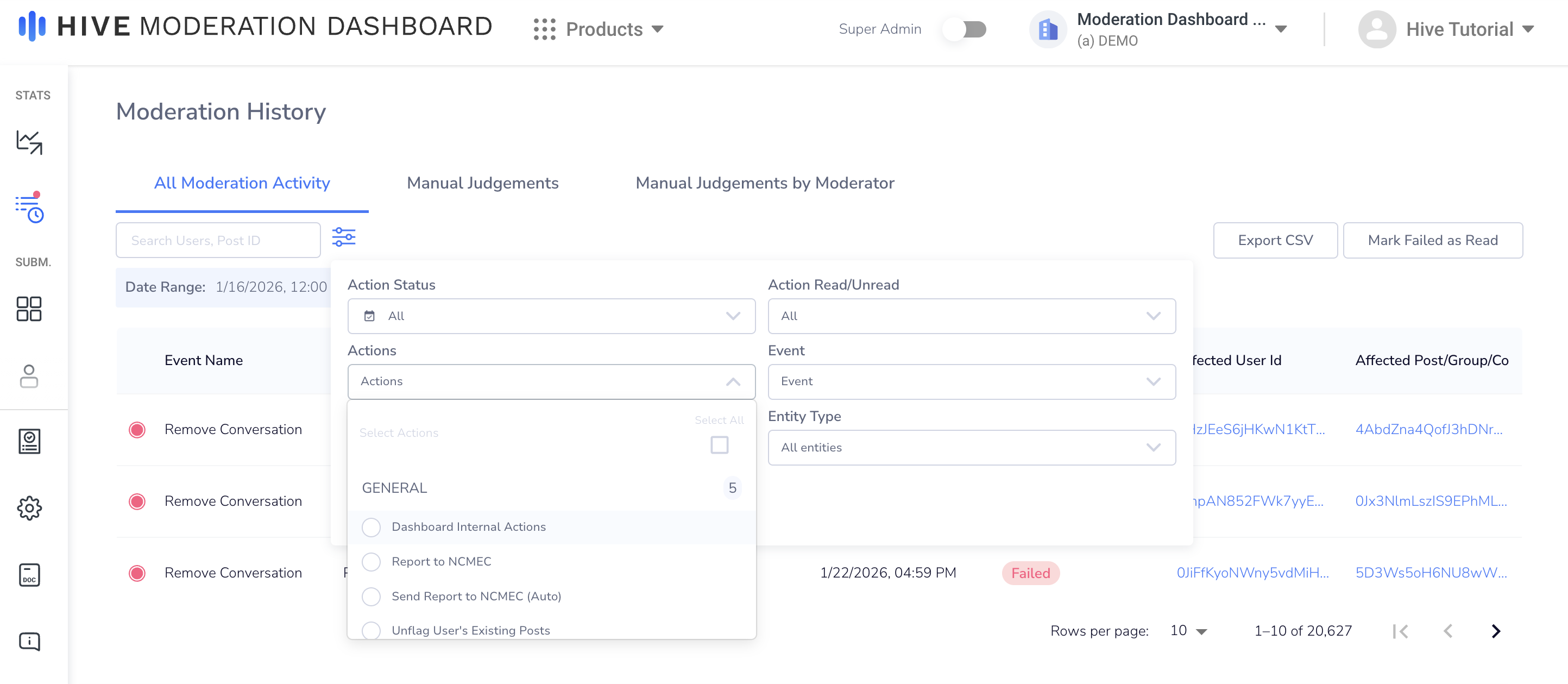 Moderation History shows all moderation events on Moderation Dashboard, including content creation, successful and failed actions, rules triggers and more.