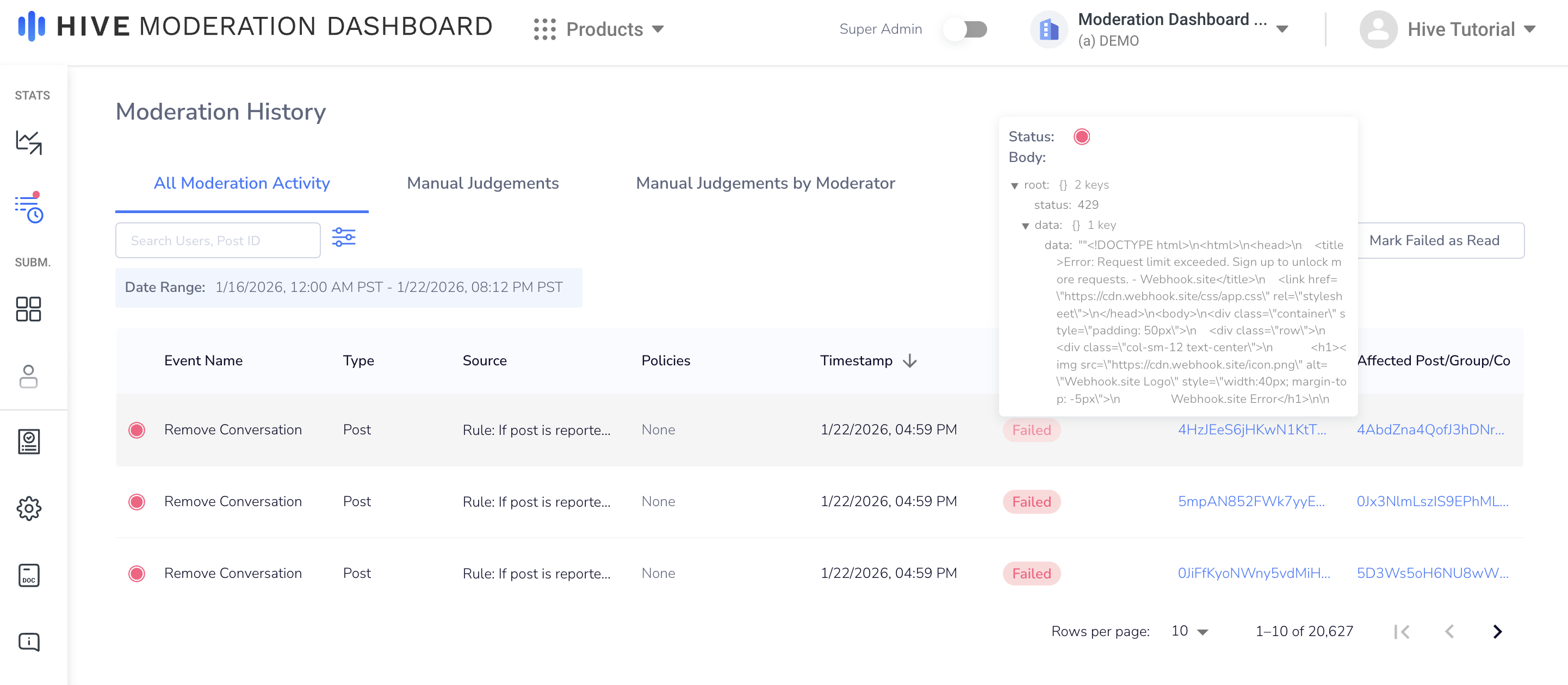 HTTP Status ResponseModeration Dashboard expects an HTTP 200 OK success status response code to verify that the action has been taken. Any other response code will be treated as a failed action and will show up in the Moderation History (see below).