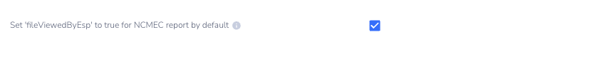 In order for NCMEC reviewers to be allowed to view the report content, they need to know your moderators have viewed the content themselves. This information is passed through the ‘fileViewedByEsp’ field. This setting, when checked, will default the field to True for all reports: