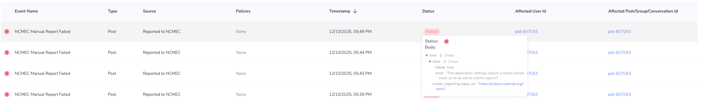 - If the platform fails to get a successful response and NCMEC Enrichment Required is checked, it will return a 400 with: