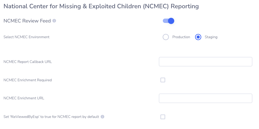 If this box is checked and the reporter does not provide an enrichment URL, the NCMEC report will be blocked and returned to the Review Feed with the error: This application settings require a NCMEC enrichment url to be set to submit reports