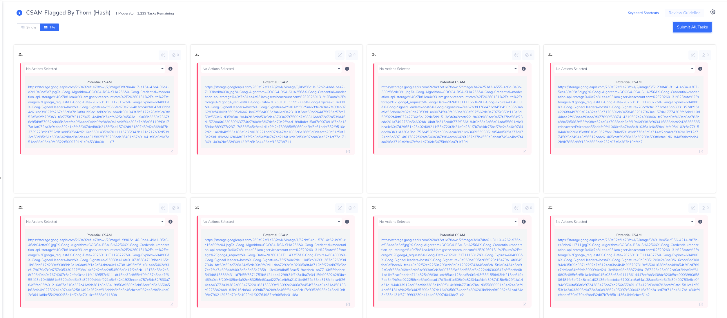 Displaying CSAM ContentModeration Dashboard will never display CSAM content in the Review Feed. Instead, each task will surface the original link that the moderator can click on to open a new tab to review the content.