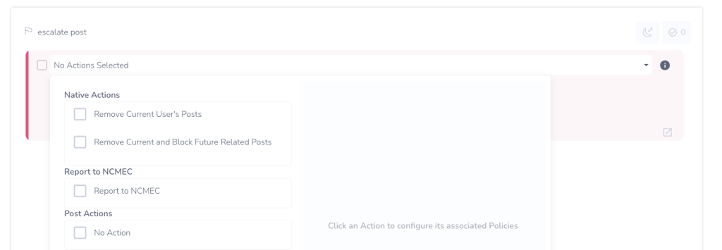 - Once you identify flagged content that meets the NCMEC reporting criteria, you can select the "Report to NCMEC" native action from the list of all actions.