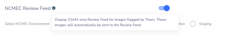 If this box is checked and an admin has not provided an enrichment URL, all NCMEC reports will be blocked and returned to the Review Feed with the error: This application settings require a NCMEC enrichment url to be set to submit reports.