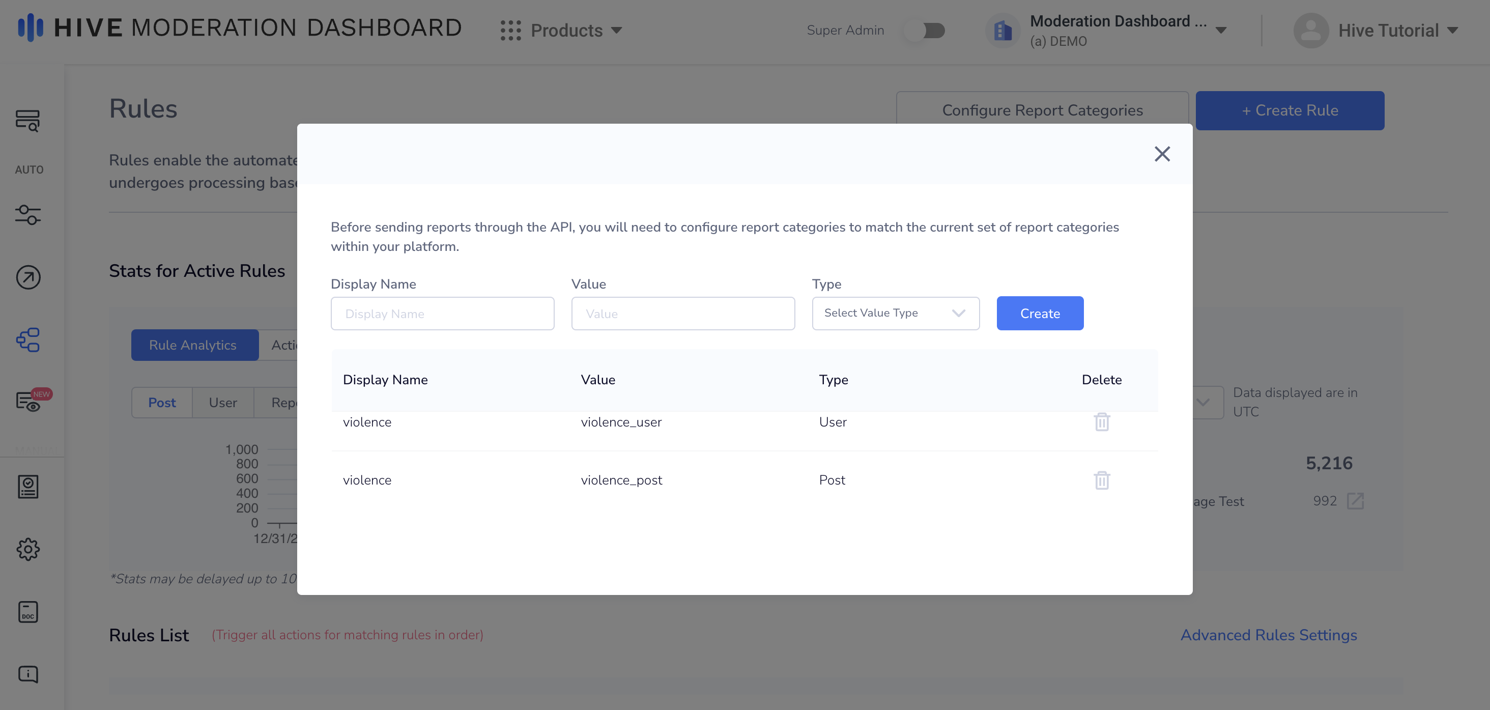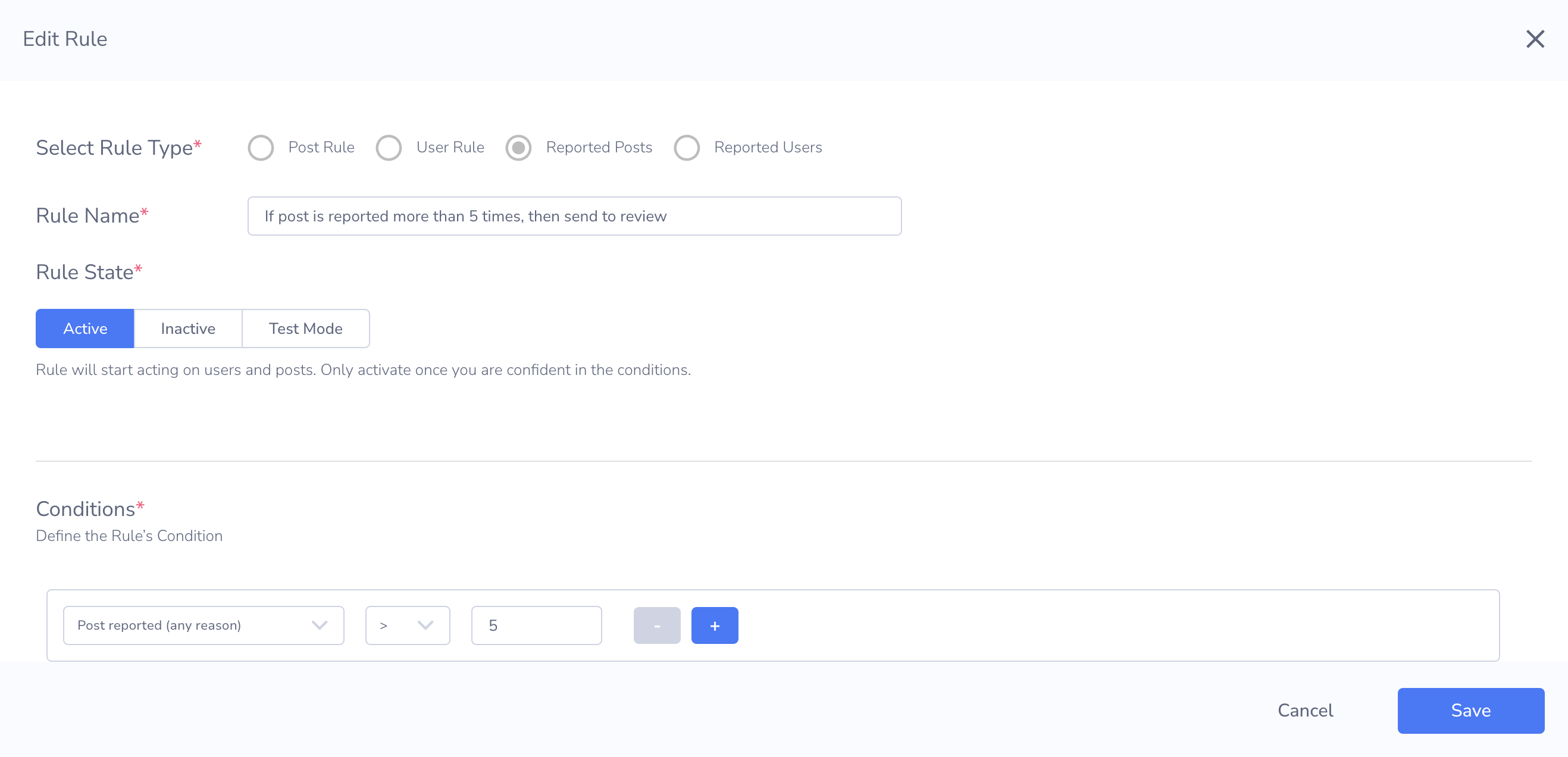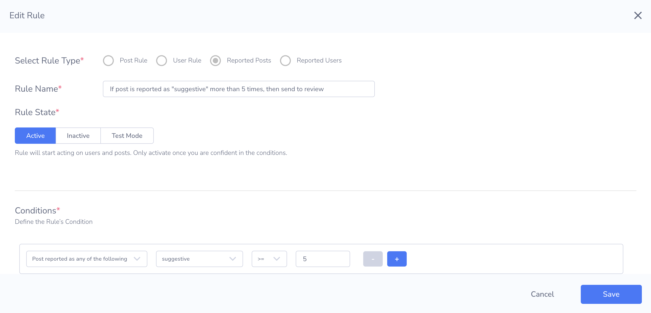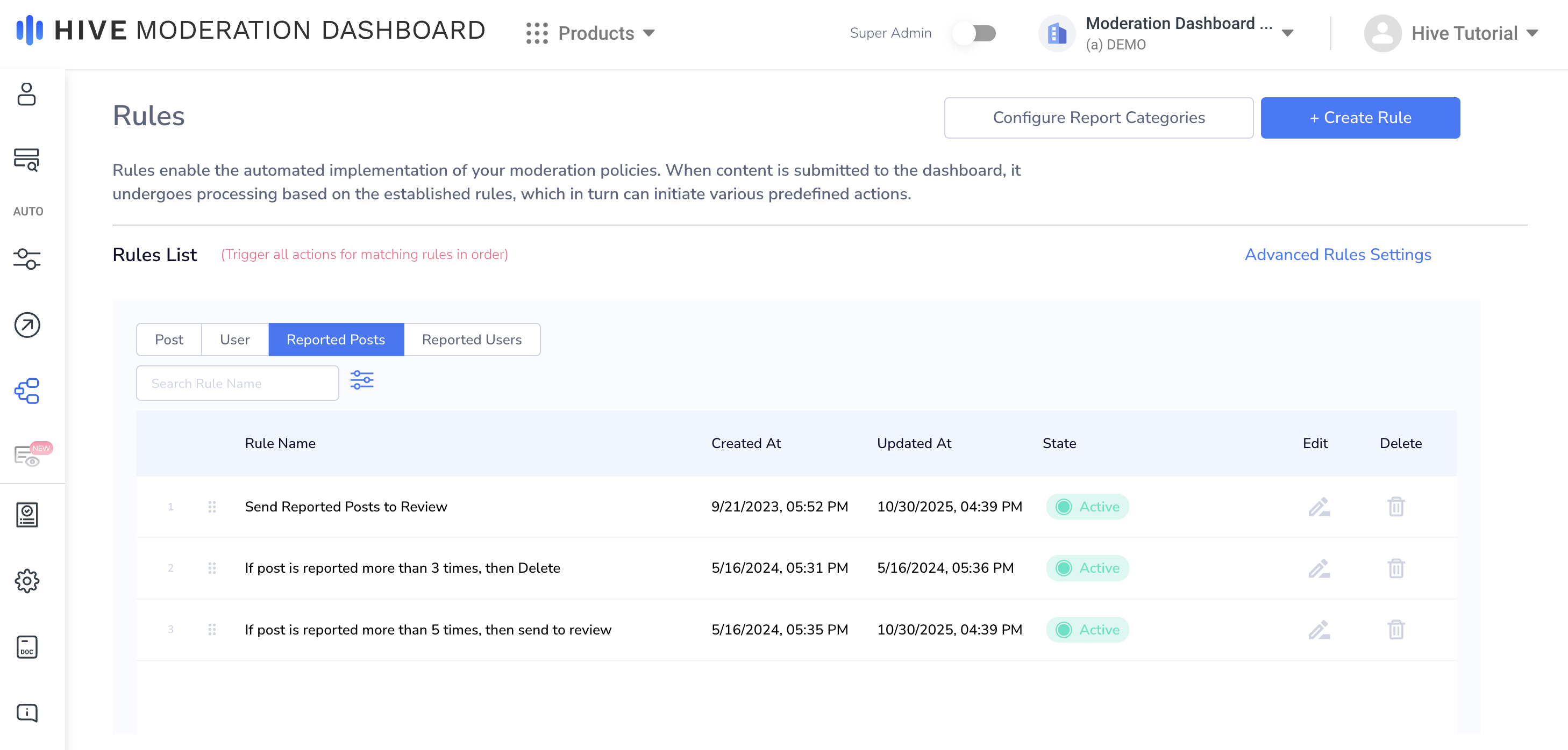 On the Rules page, you can create rules for reported posts and users. When a post or user is reported through the Reports API, if all conditions in a report rule are matched, Moderation Dashboard will trigger the rule and take any corresponding action.