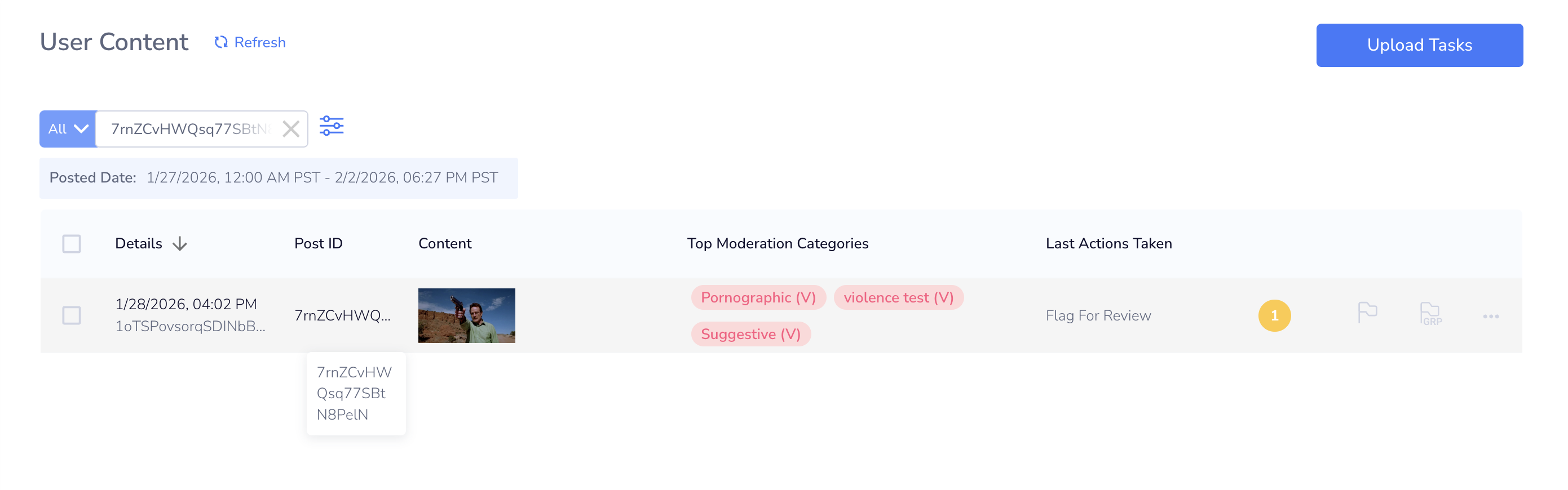 If a post has been reported, all content associated with the post will show a yellow circle on the content row and will display the number of reports submitted. Click into a content row to view the specific report categories, report reasons, and reporter ids.