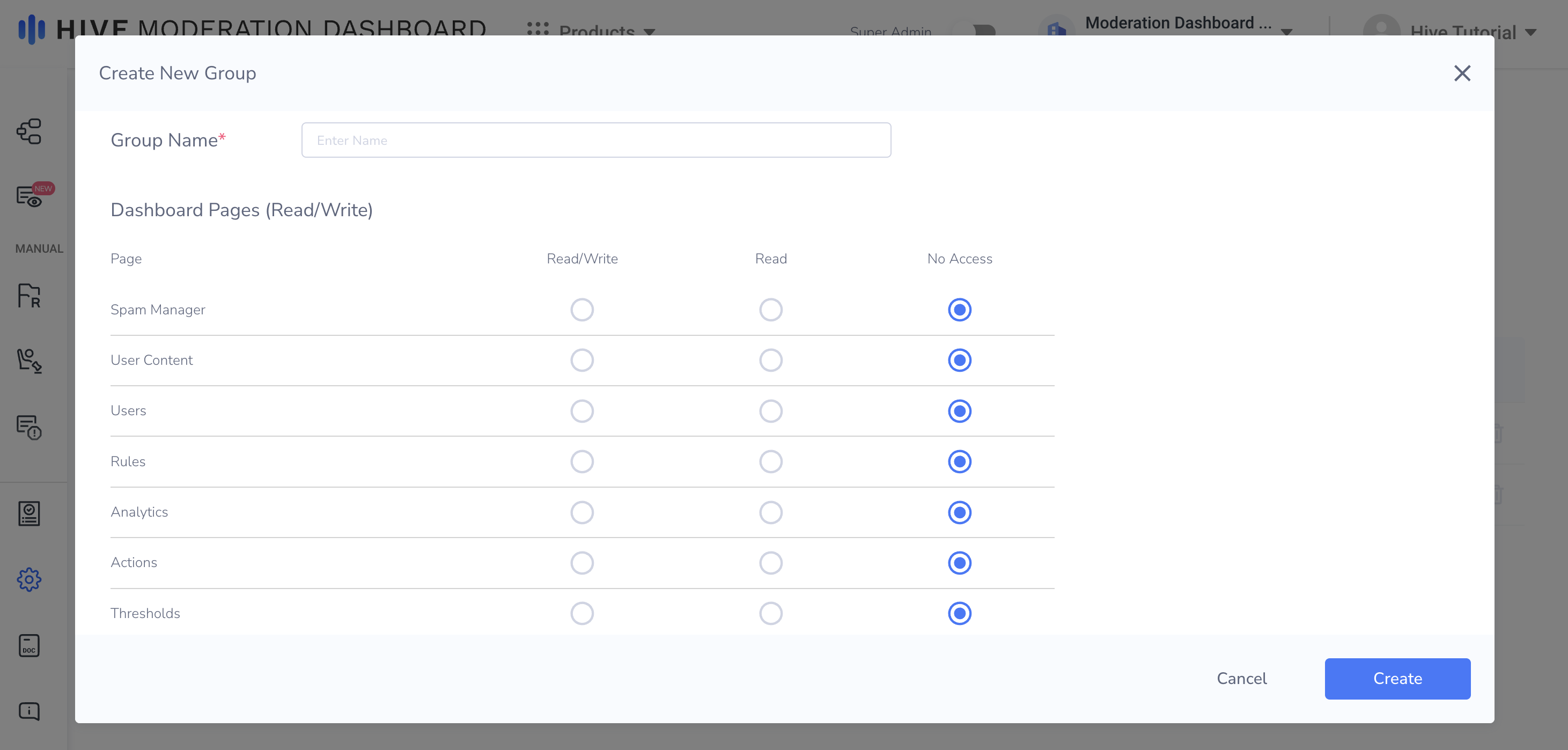 Moderator groups have access to all pages except Rules, Analytics, Actions, and Thresholds. They also have access to all Actions and Review Feeds.