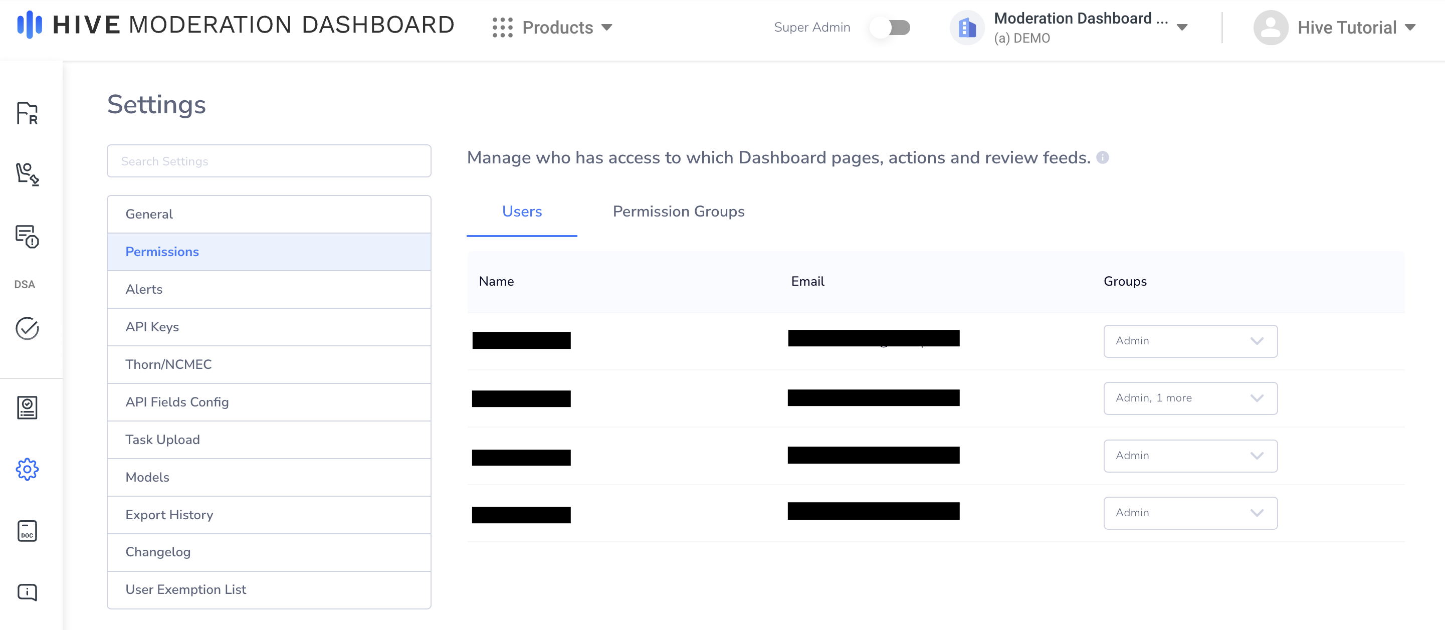 The admin users on thehive.ai are the only users that have access to the Permissions page on Moderation Dashboard. The only time you should change permissions on thehive.ai is if you would like to change who can edit Moderation Dashboard permissions. All further permission changes should be handled on Moderation Dashboard.