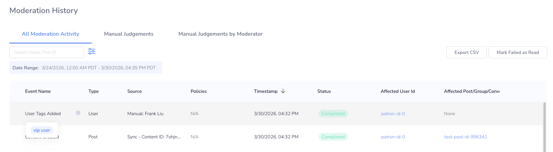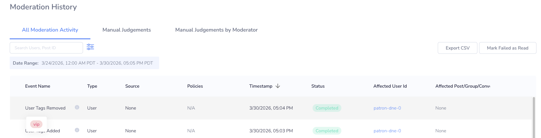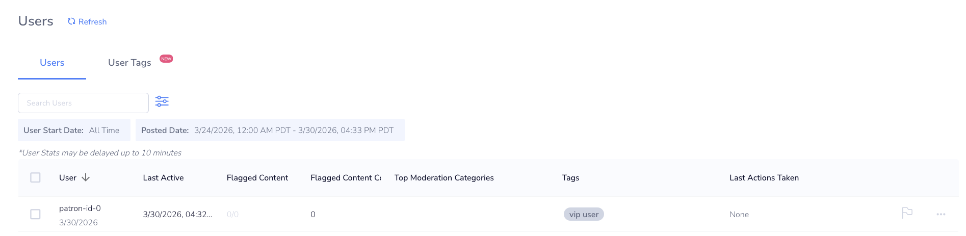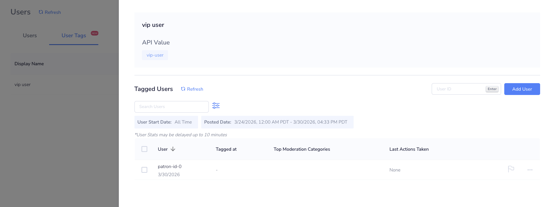 User Tags allow you to label and segment patrons on your platform. Tags can be assigned to patrons and referenced in Rules to apply conditional moderation logic.