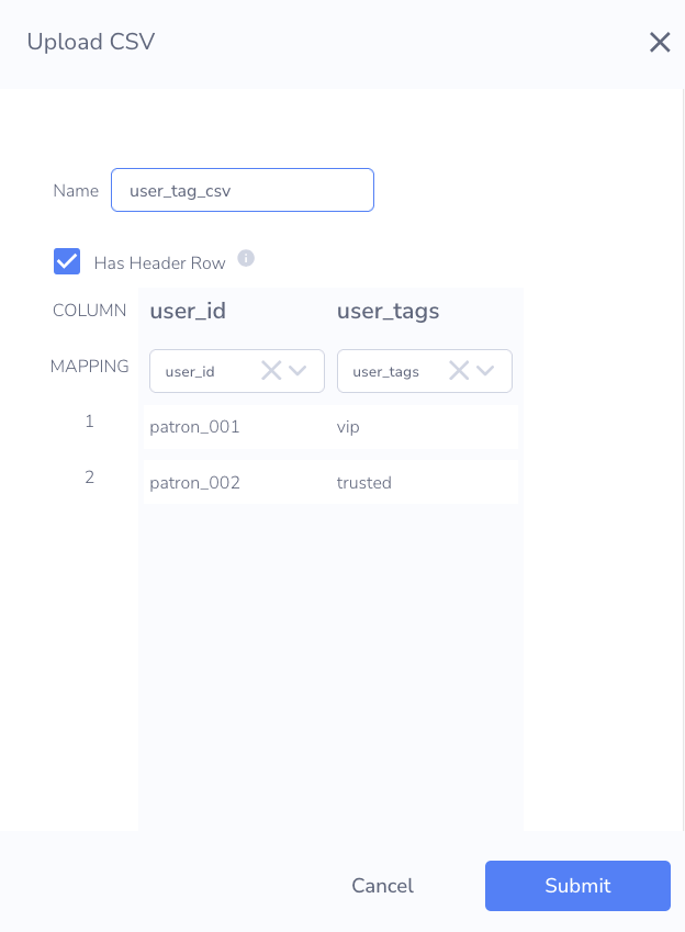 - Navigate to the User Tags page and upload your CSV file via