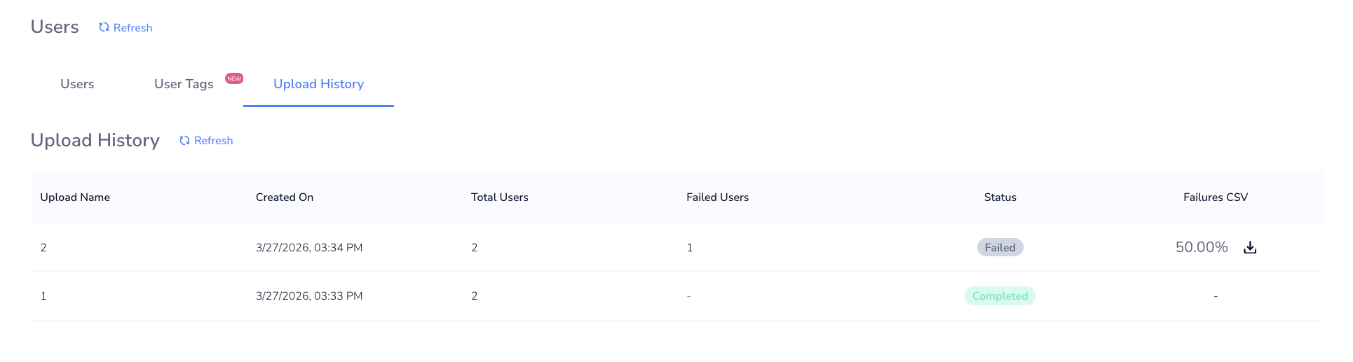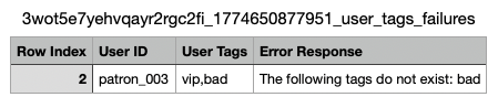 If an upload contains failures, you can download a CSV of the failed rows. The file will be named using the format {application_id}_{timestamp}_user_tags_failures (e.g., 3wot5e7yehvqayr2rgc2fi_1774650877951_user_tags_failures), where the timestamp is in epoch milliseconds. The file will include four columns:
