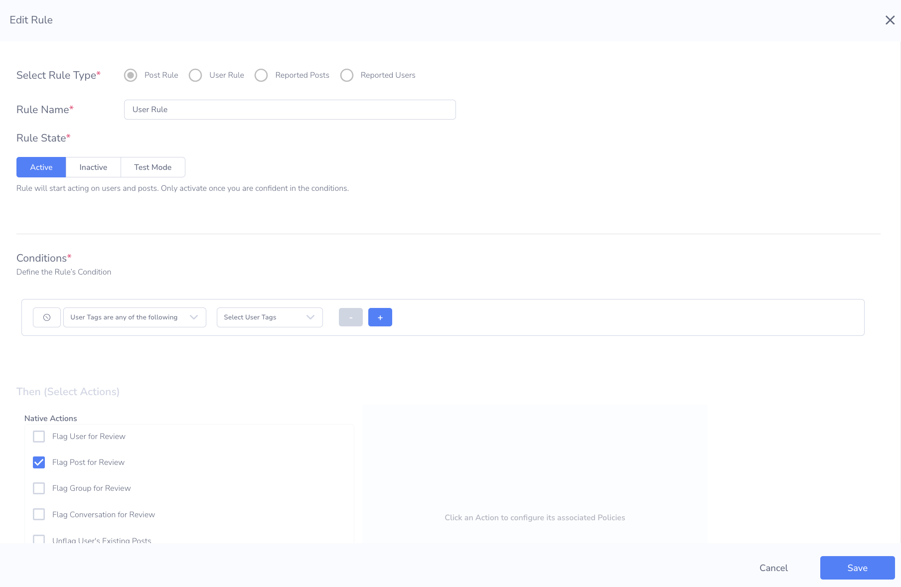 User Tags can be referenced as conditions when building Rules. This allows you to apply different moderation thresholds or actions based on how a patron has been labeled: